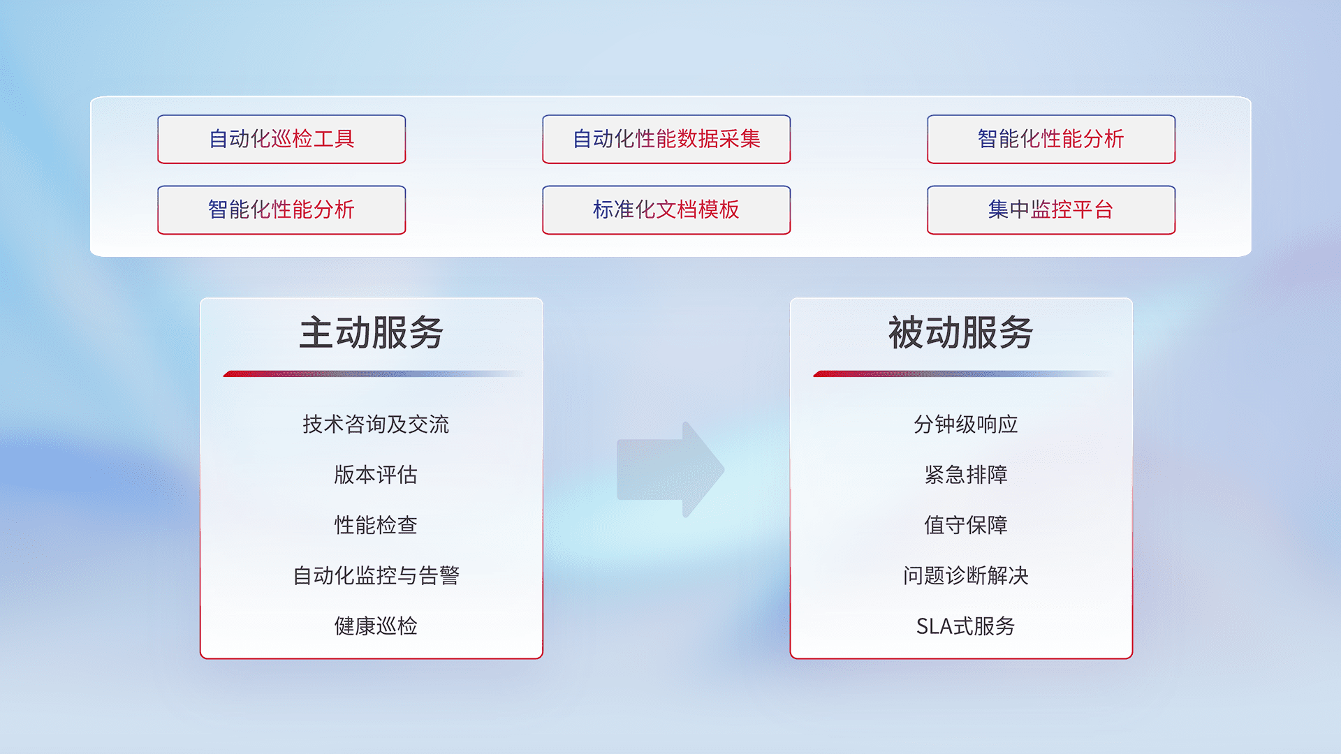 智能化工具和标准化文档,,,保障服务质量,,,提供主动服务(包含技术咨询、、、版本评估、、、性能检查、、、、自动化监控与告警、、、健康巡检)和被动服务包含(分钟级响应、、、、紧急排障、、值守保障、、问题诊断解决、、、SLA服务)。。